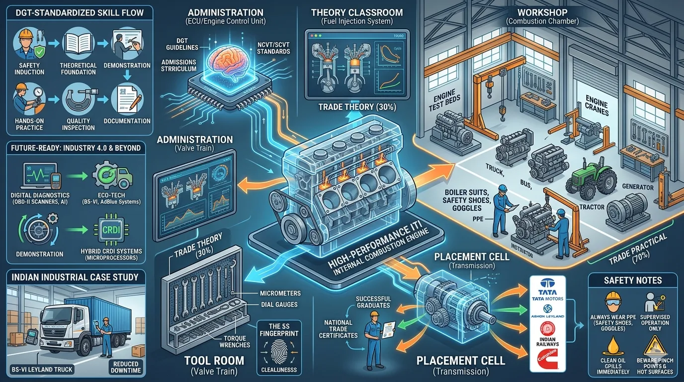 Industrial Training Institutes (ITIs) are the **beating heart of India’s manufacturing engine**, designed to transform raw potential into precision-skilled technicians. For a Mechanic Diesel trainee, the ITI is not just a school; it is a **simulated industrial ecosystem** where “Learning by Doing” is the law of the land. We exist to bridge the gap between academic theory and the high-stakes reality of the heavy-machinery workshop, ensuring every student becomes a **national asset.**